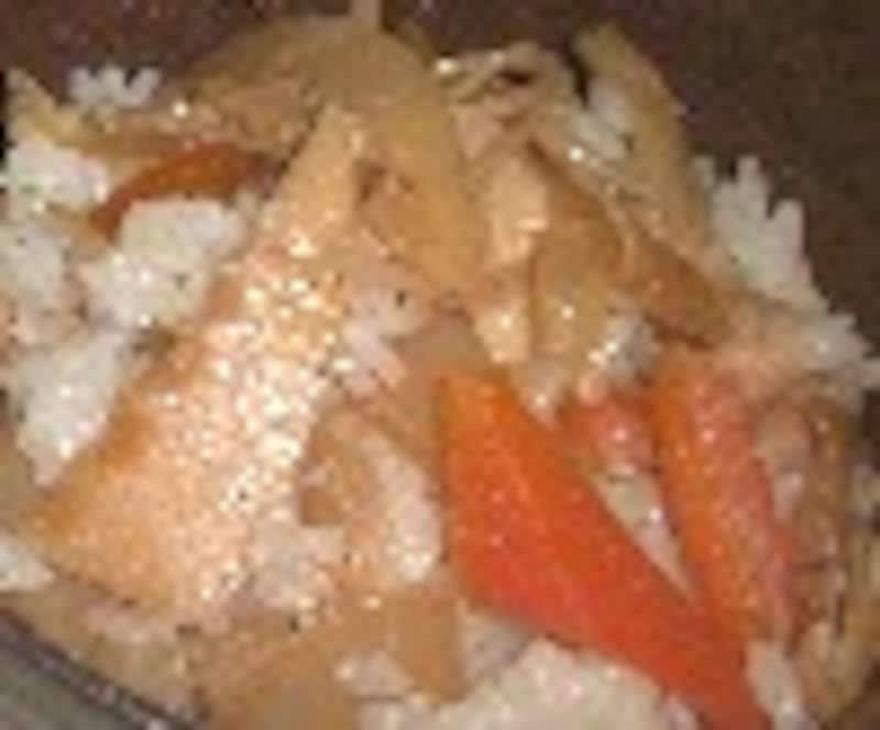 牛蒡、人参、コンニャク、竹の子等の筑前煮を、汁気がなくなるまで煮て、乾燥湯葉と一緒に薄味に炊いた御飯に混ぜる。※参考レシピ→ かやくごはん 1.