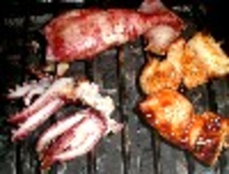 イカの胴体と足を外し、ワタをとり、酒大さじ1に塩一つまみ混ぜたものをからめ、網で焼く。