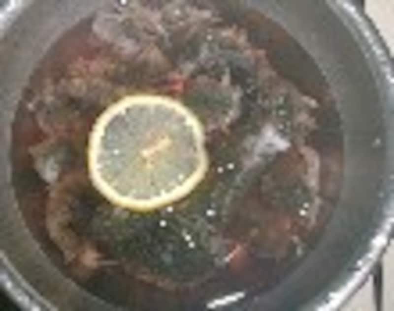 薄い酢水につけておく。レモンか柚子の輪切りを入れる。