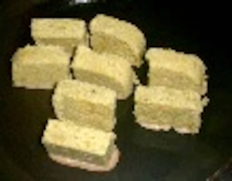 フライパンを温め、キッチンペーパーでサラダ油を薄く敷き、さつま芋に衣をつけて、6面を焼いていく。最後の面に衣をつけ、ゴマをふりかけて焼く。