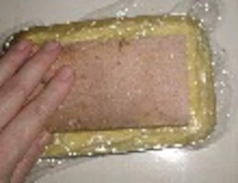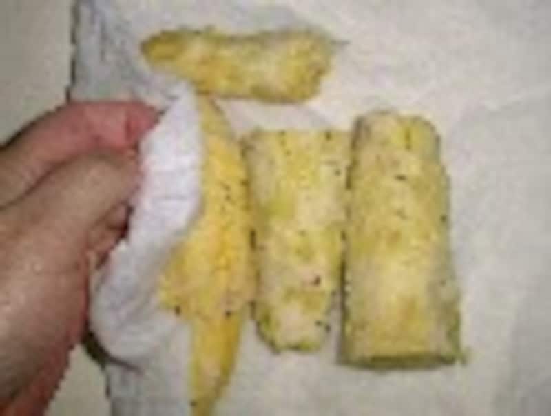 2. 皮をむいて、濡れ布巾に包んで、手のひらで押して、つぶす。