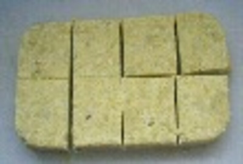 耐熱ボウルに芋を入れ、砂糖、塩、ミリン、水を入れて混ぜ、電子レンジにかけ、熱くなるまで加熱して、薄く油を塗った型に詰め、平らな物でギュッと押し付けて、形を整え、粗熱が取れたら冷蔵庫で冷ます。