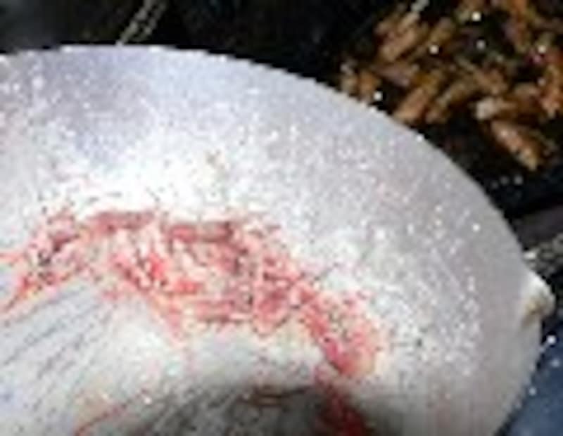 甘エビの頭をボウルに取り、塩一つまみ、コショウ少々、パプリカ粉3~4ふり、おろしニンニク耳掻き2杯程度を加えて混ぜ、小麦粉大さじ2~3杯、小麦粉の1/3量の片栗粉を加えて混ぜる。