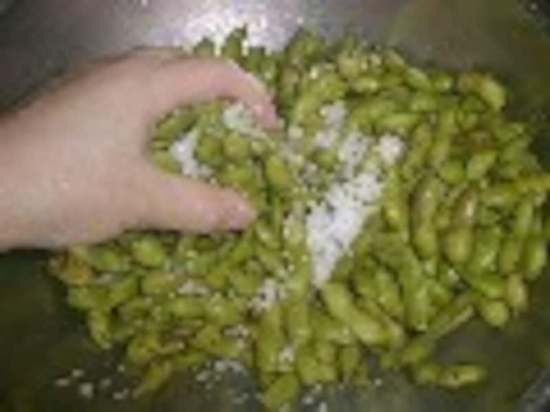 2. (20gの塩の中から)1つかみ取って豆にふりかけてもむ。(色良くゆで上げるため)