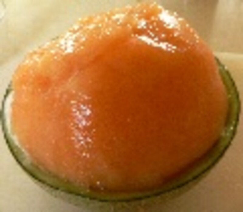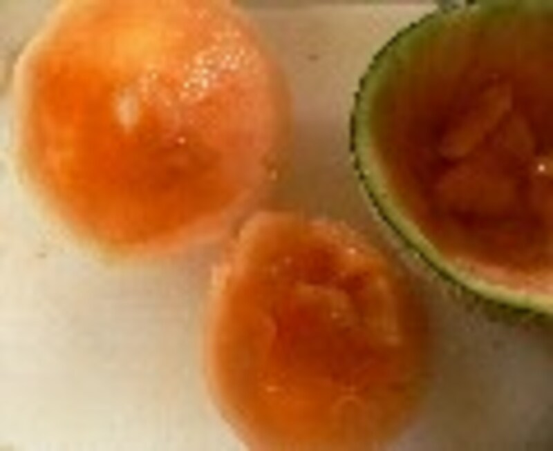 メロンを縦に置いて、高さを半分に切り、種をかき出して、最初に真ん中の部分をくり抜き、