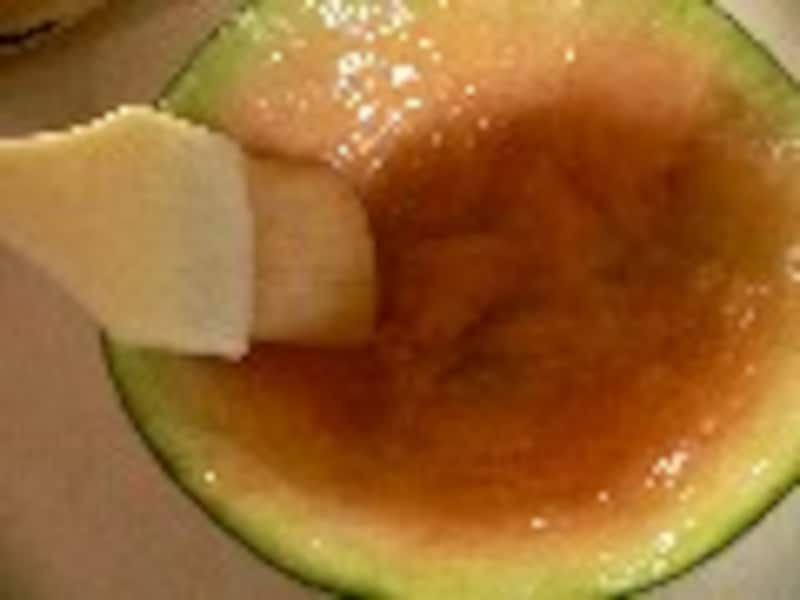 メロンの蓋をかぶせ、寒天液をぬる。(寒天が固まってたら弱火にかけて溶かすと良い)