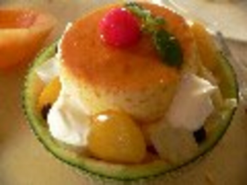 底に角切りメロンを敷き、果物やみつ豆の寒天等をのせ、プリンをのせ、ホイップクリーム