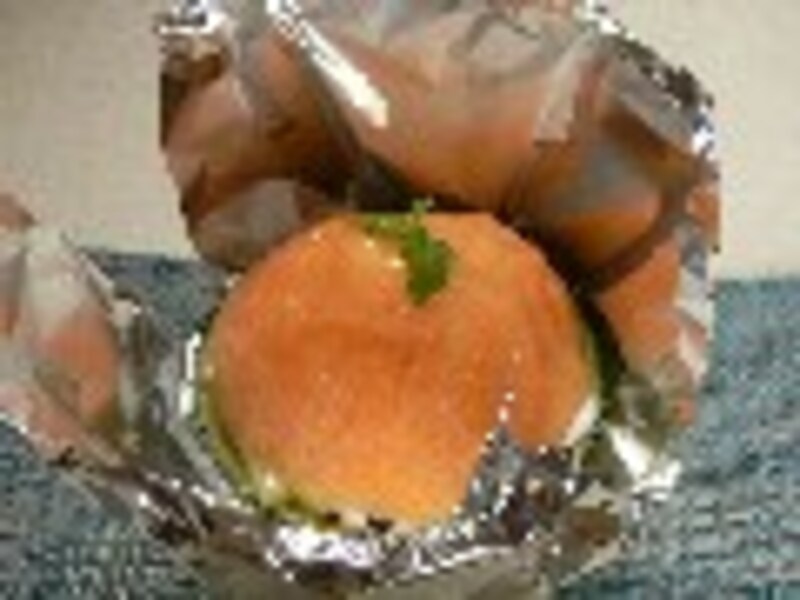 メロンが安定して置ける器の上にアルミホイルを置き、真ん中にメロンをのせ、ふっくら包む。ナイフとフォークを添えて勧める。