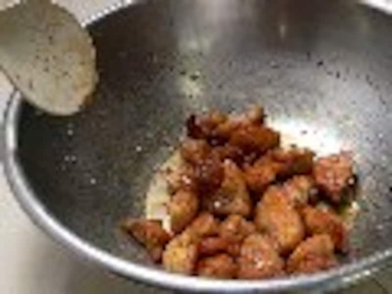 名古屋で食べた手羽先の味を再現してみました。超メンドクサガリな家人のために、 手羽先ではなくモモ肉と胸肉を使いました。手羽先を使えば、もっと名古屋名物に近づくことでしょう。仕上げにコショウをたっぷり振り掛けて下さい。ビールがすすむこと請け合いです。 手羽先餃子の作り方/鶏肉レシピ 骨がないから食べやすい 鶏の唐揚げの甘辛ダレからめ ■使用した材料■ 4人分 ・鶏のもも肉と胸肉 ...................各1枚ずつ ・塩 .........................少々 ・コショウ ...................少々 ・片栗粉 ...................大さじ2 タレ(作りやすい量) ・しょう油 ...................50cc ・みりん .....................50cc ・酒 .........................50cc ・はちみつ ........................大さじ1 ・酢 ........................小さじ1 ・ニンニク ...................2片と1/2 (スライスする) ・ショウガ ........................薄切り4枚 仕上げ ・白ごま ........................適量 ・コショウ ........................たっぷり ■作り方■ 1. 鶏肉は大きめの一口大に切り、塩コショウし、片栗粉を振り込んで混ぜる。 2. 鍋にタレの材料を入れて2~3分煮つめてそのまま冷ます。後で肉にからめる直前にニンニクとショウガを取り除く。 3. (1.)の肉を、低温(150~160℃)の油で揚げて取り出し、高温にしてもう一度カラリと揚げて油を切る。 4. 熱々をボウルに取り、タレをからめ、コショウをたっぷりふりかける。 (肉の量に対してタレの量が多めになってますので加減してください。コショウは2種類、例えば黒のテーブル胡椒と白胡椒を使うといいです。たっぷり目が美味しいです。) ■ 昨日紹介したのは【メロンアラモード】 【編集部おすすめの購入サイト】Amazonで人気レシピの書籍をチェック!楽天市場で人気レシピの書籍をチェック!※記事内容は執筆時点のものです。最新の内容をご確認ください。※衛生面および保存状態に起因して食中毒や体調不良を引き起こす場合があります。必ず清潔な状態で、正しい方法で行い、なるべく早めにお召し上がりください。また、持ち運びの際は保存方法に注意してください。