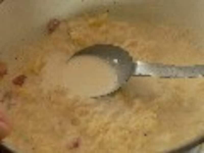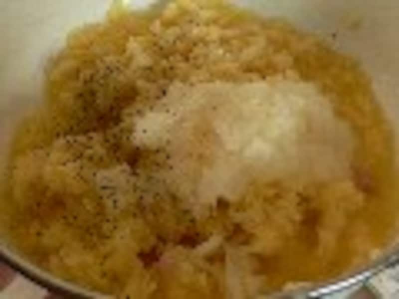 じゃが芋の皮をむいて、粗い目ですりおろし、玉ねぎもおろして入れ、ベーコンは5ミリ角に切って加える。