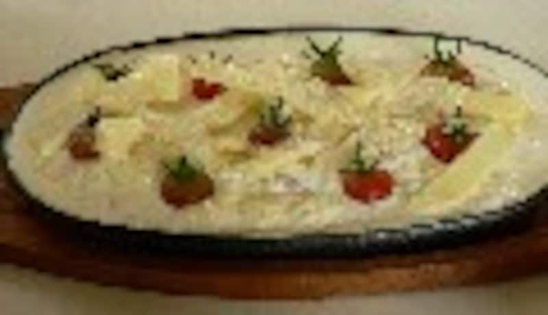 短冊に切ったチーズをのせ、パン粉をふりかけ、所々にバターをちぎってのせ、オーブントースターで12分位焼く。