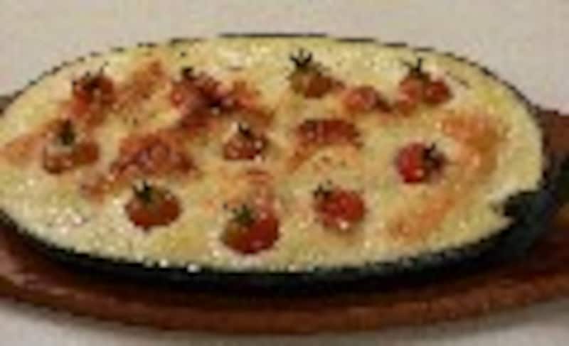 グラタン皿にバターをぬり、(2.)を流し入れ、ミニトマトを押し込み、