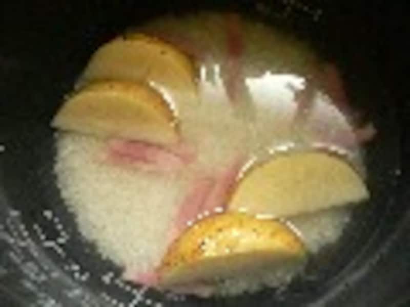 米をといで、心もち少なめの水加減をし、細切りベーコンと塩を一つまみ加え、皮を綺麗に洗って芽をくり抜いて4つに切ったじゃが芋をのせて普通に炊く。