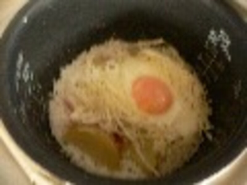 スイッチが切れたら、素早く卵を割り入れ、蓋をして5~10分ほど蒸らし、卵を好みの硬さにする。