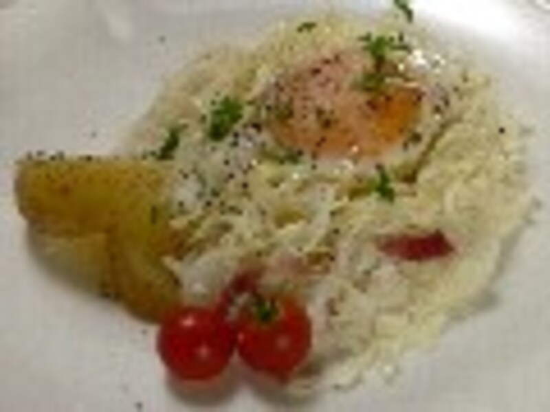 米1合 ・ ベーコン1枚 ・ じゃが芋1/2個 ・ 卵2個 ・ キャベツかレタス ・ 塩 ・ コショウ ・ 粉チーズ ・ 刻みパセリ