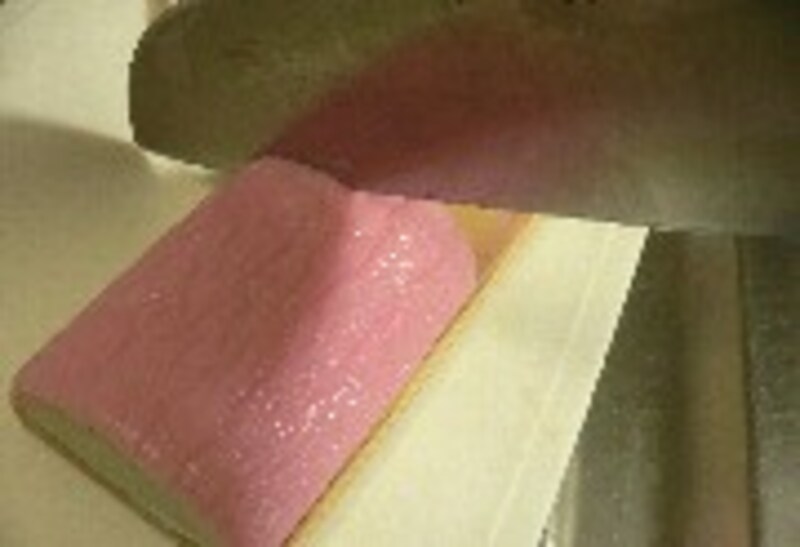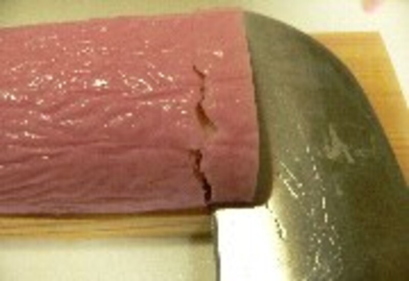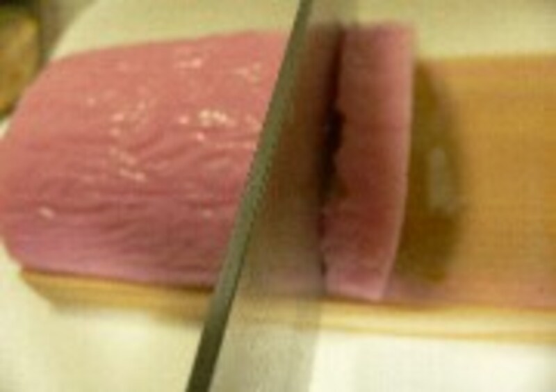 このページでは、蒲鉾の扇切りを紹介します。一般的な家庭用包丁を使いました。 野菜の飾り切りの仕方 蒲鉾の扇切り 1. 板に付いたままの蒲鉾を横に置き、包丁をあてがい、包丁の先をまな板に押し付けて固定し、そのまま包丁を下ろし、蒲鉾を少し切り込む。 2. 包丁の先を支点にして、包丁を左右に細かく動かしながら、ギザギザに切る。 (包丁の動かし方次第で、ギザギザが大きくもなれば小さくもなる。) 3. 板に沿って包丁を横に入れて切り離す。 ■次のページは 【蒲鉾の手綱切り】 前のページへ123次のページへ