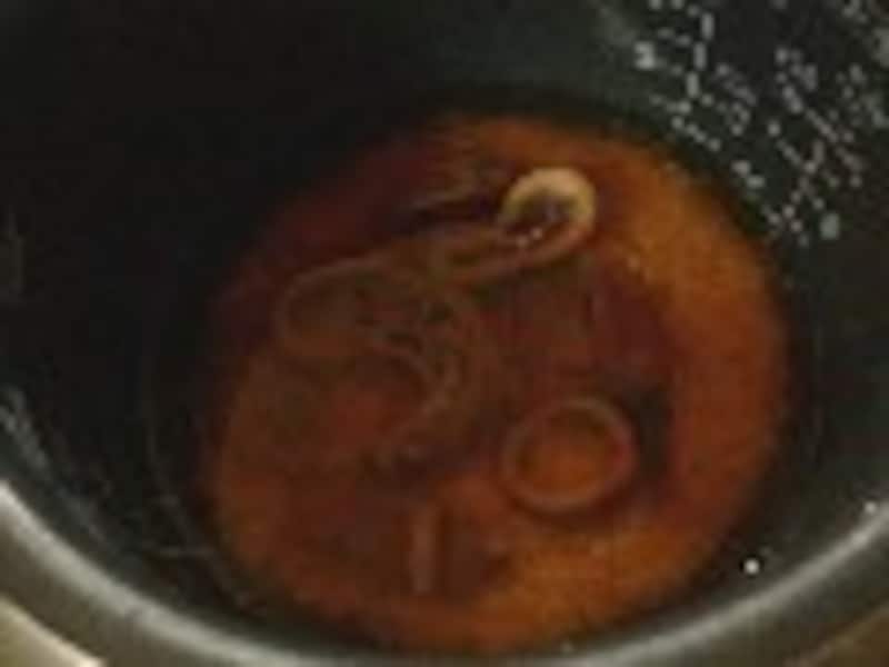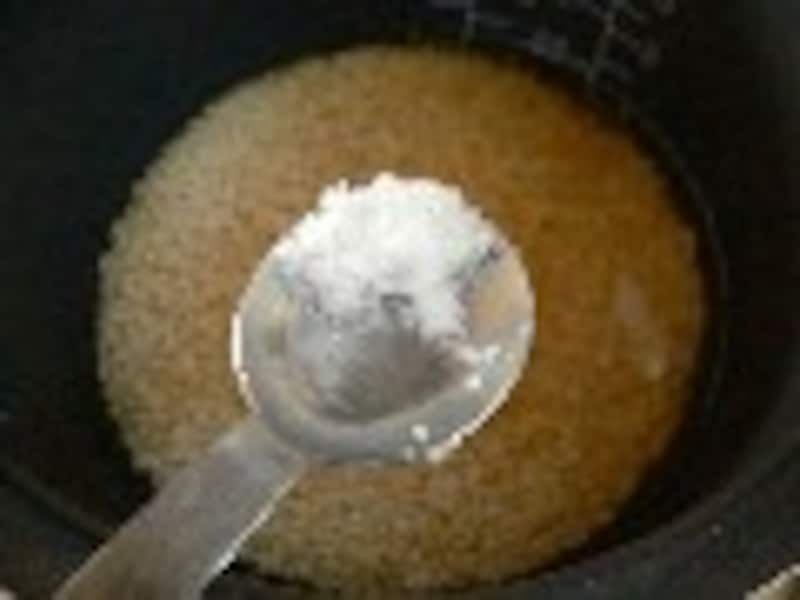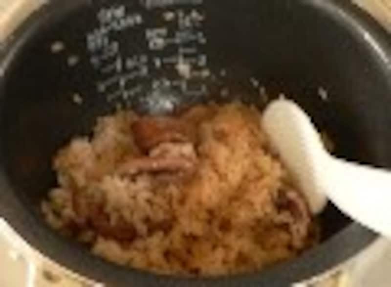 (1.)に缶詰の汁を入れて、酒、しょう油、塩を入れ、1合半の水加減をする。(おこわ用の目盛りがあればおこわ用で、無ければ白米用より心もち少なめに)