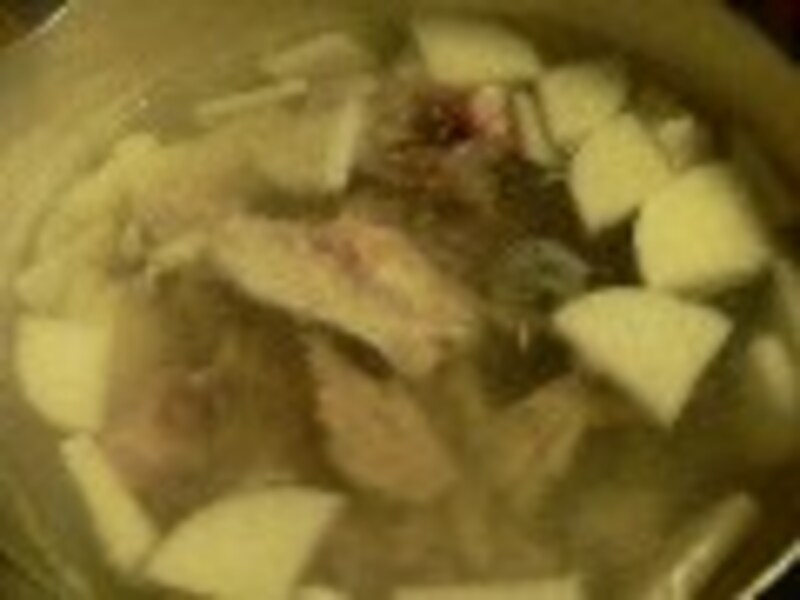 山形県の庄内地方では、寒の季節に獲れる真鱈のことを特に寒鱈と呼び、冬の最高のご馳走として、もてはやされます。一年で一番寒いこの時期の鱈は、丸々と太り、脂がのりにのっていて、味も値段も絶頂期を迎えます。1月の中旬ともなれば、近隣の町のアチコチで、タラ汁やどんがら汁を売りにした“寒鱈まつり”なるものが開催されます。 真鱈(しかも大きければ大きいほど良い)を、丸ごと一匹買わないと、ほんとにおいしいどんがら汁は作れないので、少人数の家族にはちょっと荷が重いため、観光客だけでなく、地元の人々も沢山押し寄せて、毎年、大盛況の様子です。 今日は、捨てるのは、 尾の先と胃袋の中身だけの真鱈の、新鮮なアラと内臓を使って作る、どんがら汁を紹介します。 どんがら汁に欠かせない内臓の、中でも絶品なのが白子で(当然オスの方が数倍高い)、どんがら汁に入れれば美味しさは跳ね上がるのですが、新鮮な白子をお刺身で食べた事が一度でもある者は、そのふくよかな味わいに圧倒され...、いつも、鱈を前にして迷うことと相成ります。白子をどんがら汁に入れようか、それとも生で食べようか...。 たらのキムチ鍋 冬の汁物集 山形&庄内地方の郷土料理 別名寒鱈汁 鱈のどんがら汁 ■使用した材料■ 4人前 ・タラのアラ(頭・油わた・胃袋等) ..........小さめの真鱈1尾分 ・大根 ..................350g ・豆腐 ..................1丁 ・長ネギ ...............3本 ・水 ..................6カップ ・出し昆布 ................10cm ・みそ ................70g位 ■作り方■ 1. タラのアラはぶつ切り(魚屋さんで切ってもらうと良い)。油わた(写真)は一口大に切る。胃袋は中を取り除いてしっかり洗ってぶつ切り。 大根は銀杏切り。豆腐は大ぶりに切る。長ネギは斜め切り。 2. 鍋に大根と出し昆布と水6カップほど入れて火にかけ、煮立ったら昆布をとる。 3. アラを入れ、アクをすくい取りながら、5~6分煮てダシを出す。 (身を入れる場合は、あまり煮ると崩れるので、後半に投入する。) 4. 豆腐と味噌を入れ、あれば白子を入れ、長ネギを入れ、一煮たちさせて出来上がり。 5. どんぶりに盛る。岩のりをのせて食べると尚更おいしい。 6. 新鮮な白子は、生のまま、ネギとしょう油をかけて食べるのが、最高に美味。 ■ 昨日紹介したのは 【タラのキムチ鍋】 【編集部おすすめの購入サイト】Amazonで人気レシピの書籍をチェック!楽天市場で人気レシピの書籍をチェック!※記事内容は執筆時点のものです。最新の内容をご確認ください。※衛生面および保存状態に起因して食中毒や体調不良を引き起こす場合があります。必ず清潔な状態で、正しい方法で行い、なるべく早めにお召し上がりください。また、持ち運びの際は保存方法に注意してください。