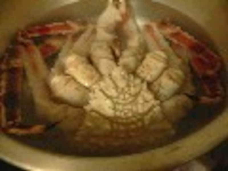 蟹の前かけを前に引っ張って、包丁で切れ目を入れて、内臓をスプーンでかき出して、よく洗う。(たらば蟹のミソは、毛蟹等と違い、加熱しても固まらないので、茹でる前に取り除く。たらば蟹のミソは、普通は食べない。)