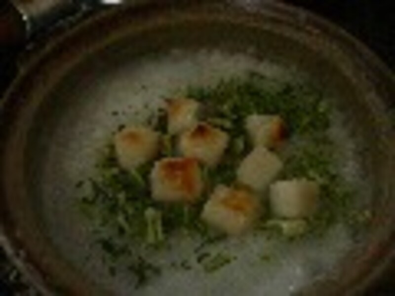3. 塩少々(2つまみ位)を振り入れ、フリーズドライ七草を加えて軽く混ぜ、焼いた餅を入れて蓋をして火を止め、数分蒸らしてできあがり。 (生の七草使用の場合は一煮する。餅は小さく切って焼くか、焼いたものを千切って加える。又は、硬いまま切って、七草を入れる前に加えて煮込んでも良い。) ■ おすすめ七草がゆレシピ ・七草のしょうゆ漬けと中華粥 |