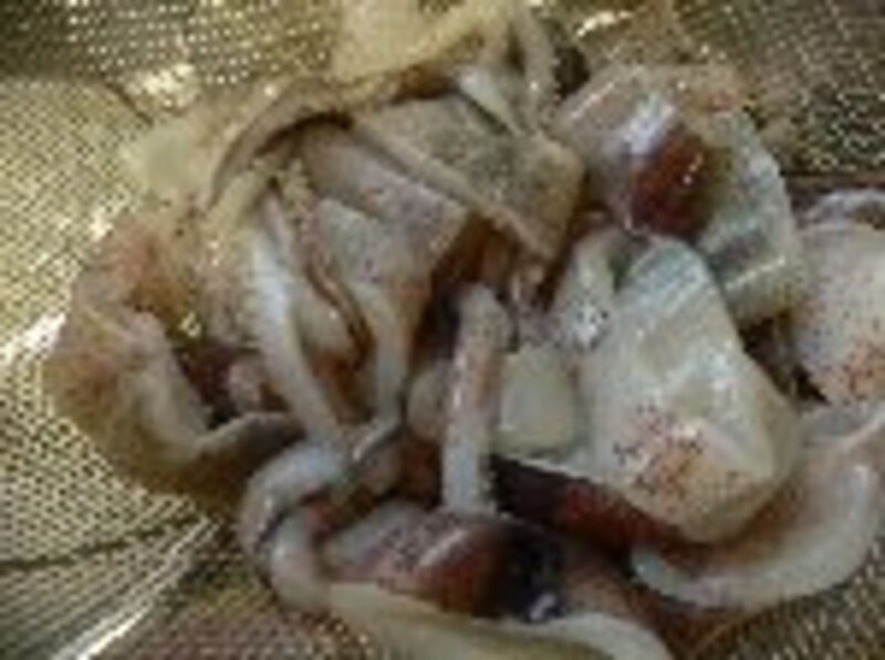 長ネギは5ミリ角に切る。イカはワタを取り出して洗い、輪切りにしてザルに上げる。椎茸は4つに切る。ピーマンは半分に切って種を取って縦に3つ位に切る。