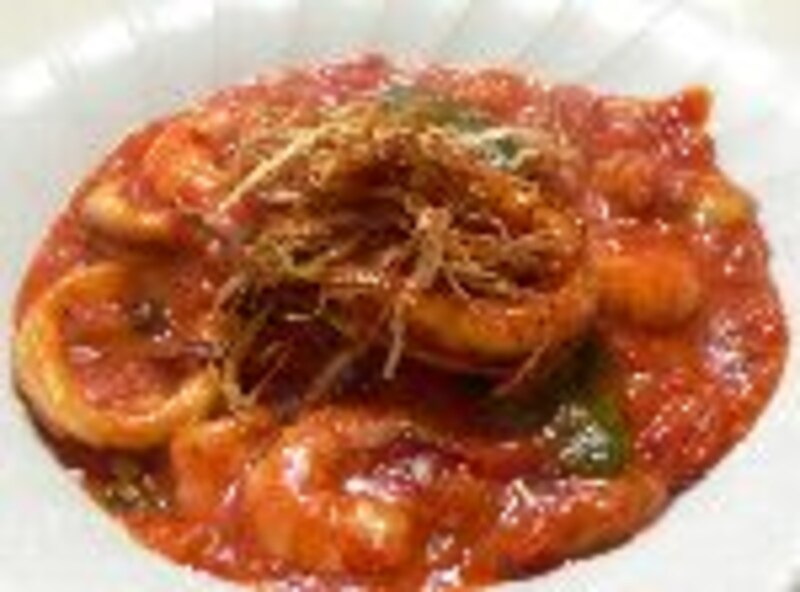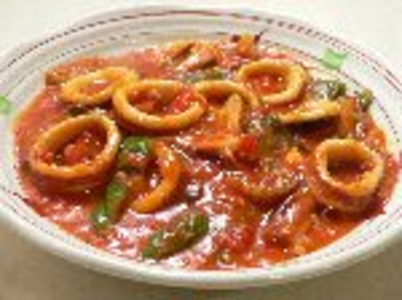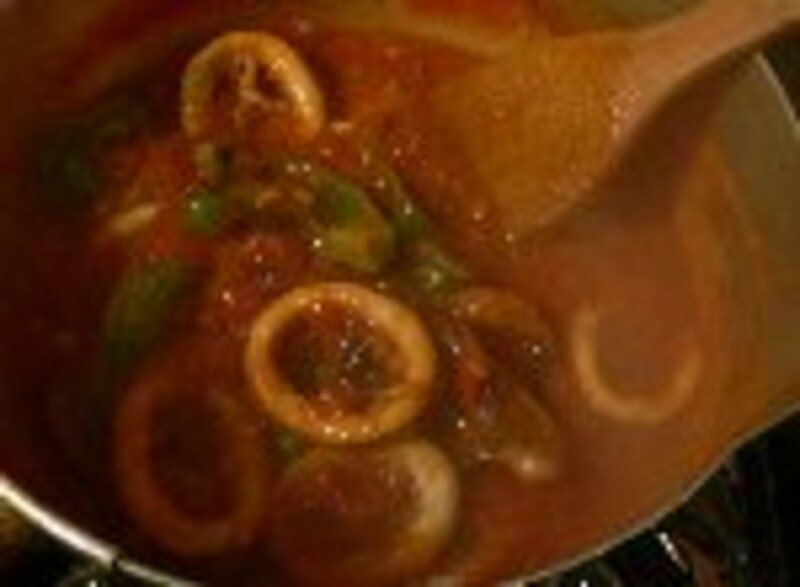 イカと椎茸とピーマンをトマトソースに入れて、軽く煮てからめる。