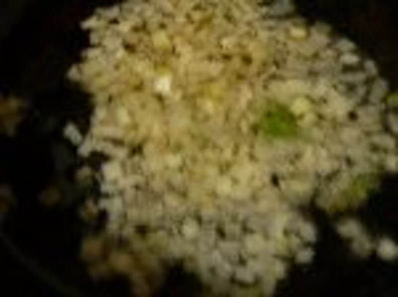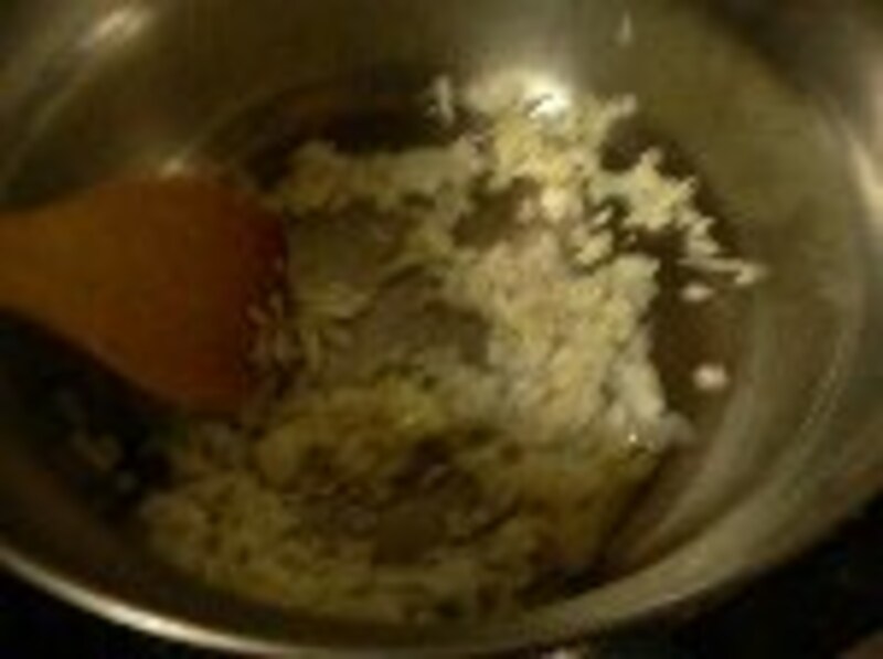 鍋にオリーブオイルを熱し、みじん切りニンニクを炒め、香りが出たら玉ねぎを炒め、