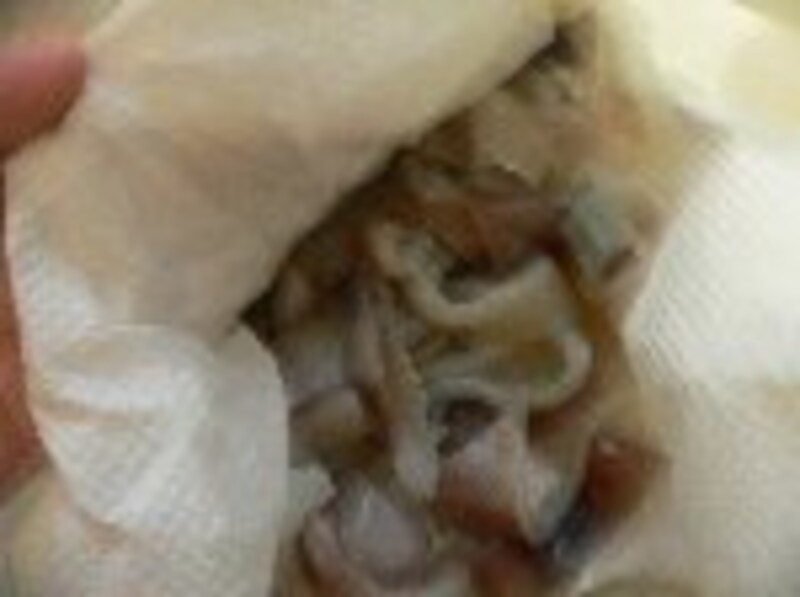 イカをキッチンペーパーで包み、水気をしっかりふきとる。