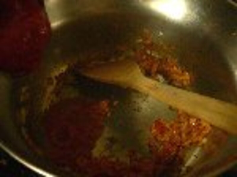 水煮トマトを加え、木ベラで崩しながら炒める。