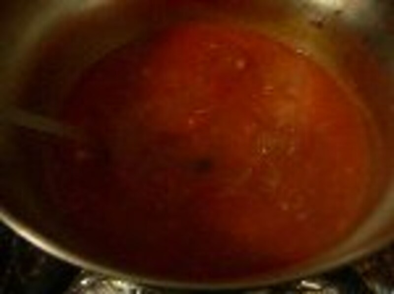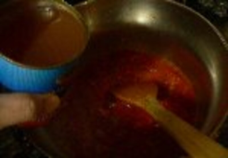 (7.)に、トマトケチャップ、塩(三本指で2つまみ程度)とコショウ少々で味つけし、ブールマニエを加えて煮溶かし、とろみをつける。