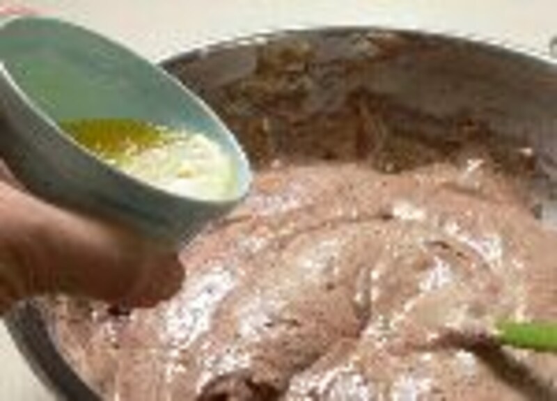 小麦粉ココアを広げ入れ、ゴムベラで、練らないようにさっくり混ぜ合わせる。