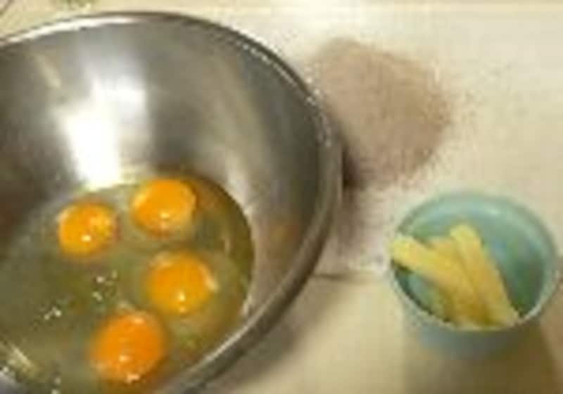 ボウルに卵を割り入れ、軽く混ぜ、砂糖を加え、