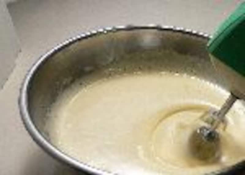 風呂の温度ぐらいの湯煎にかけ、ハンドミキサーで攪拌する。