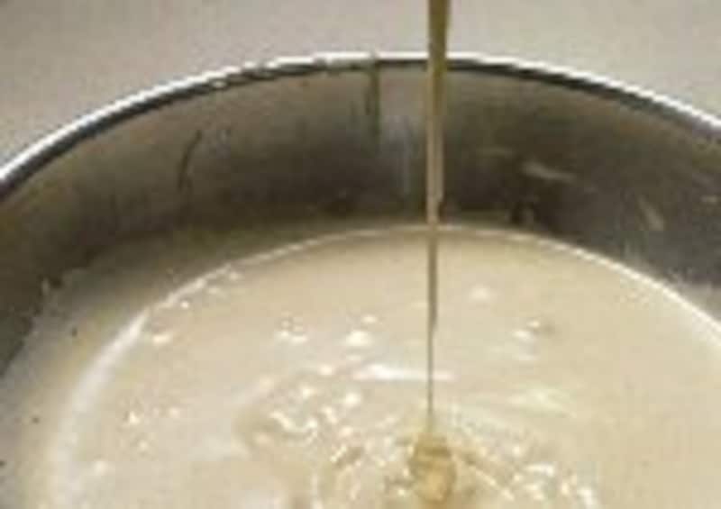 温かい牛乳をまわし入れ、ゴムベラで底をすくい上げるように混ぜる。