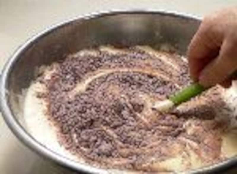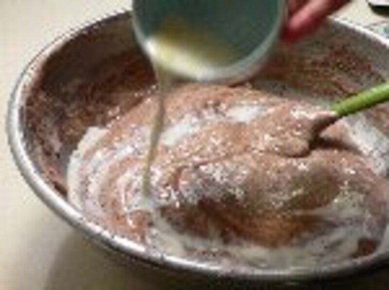 小麦粉ココアを広げ入れ、ゴムベラで、練らないようにさっくり混ぜ合わせる。