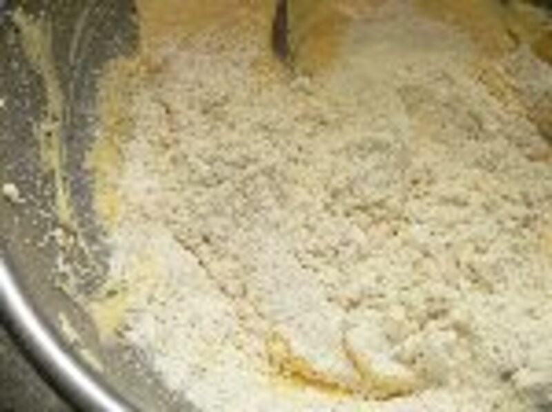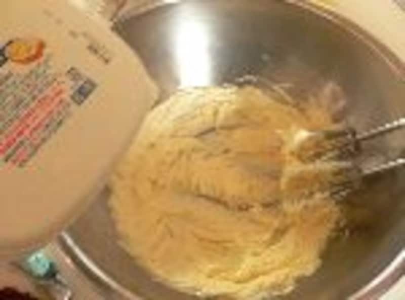 溶き卵を少しずつ加えながら混ぜていく。(一度に加えると分離する。)