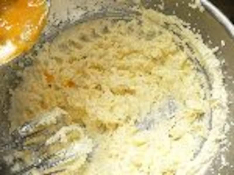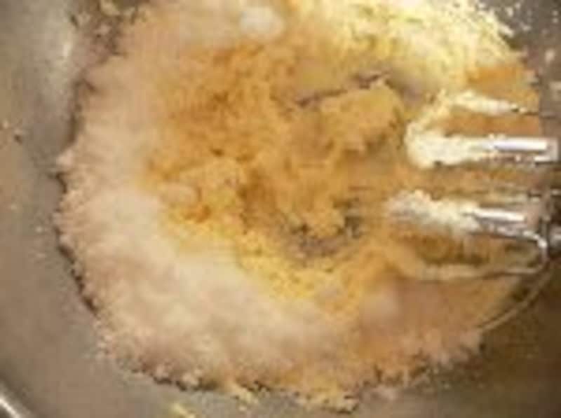 砂糖を加えて更に混ぜ、白っぽくふんわりした状態にする。