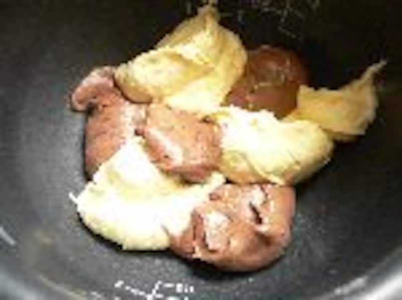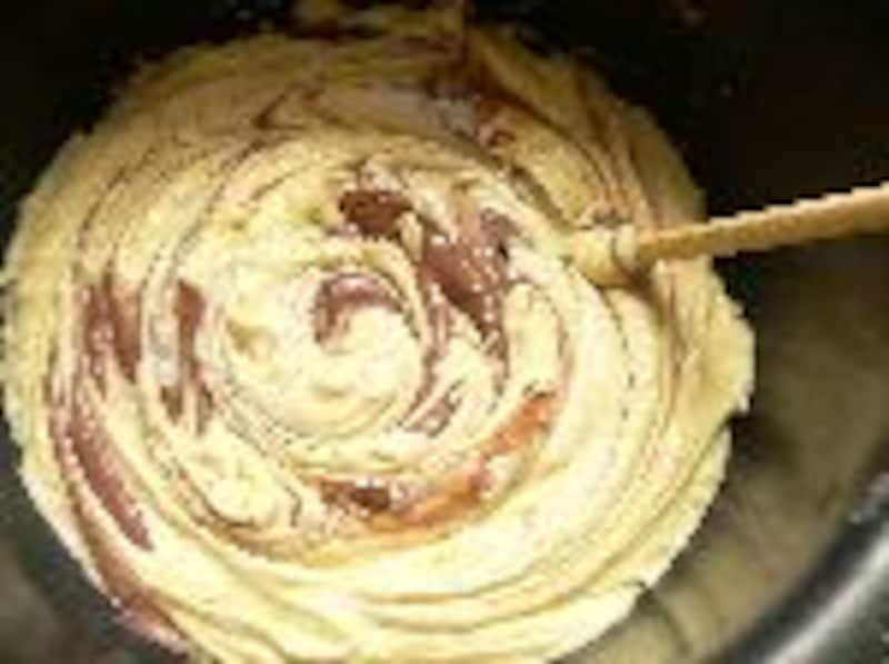 内釜を、サラダ油をつけたペーパーでふき、ココア生地と白生地を交互に入れる。