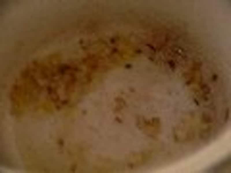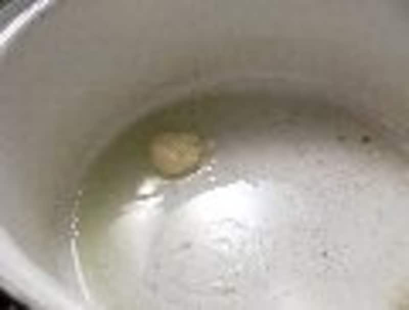 鍋にオイルと叩いてつぶしたニンニクを入れて弱火で炒め、ニンニクの匂いをオイルに移して取り除く。