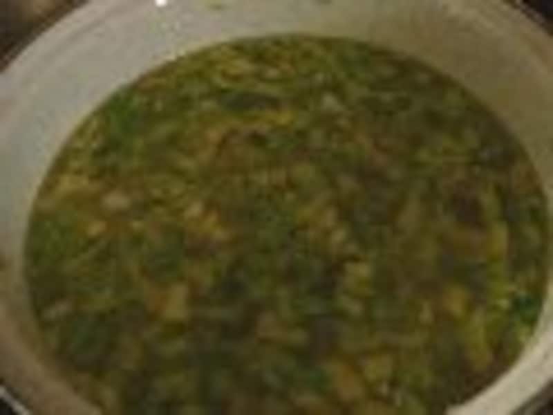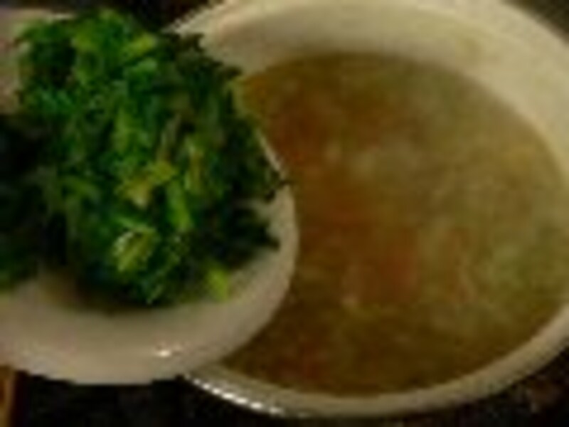 野菜がほぼやわらかくなったら、塩とコショウで味付けし、大根と蕪の葉を入れてやわらかくなるまで煮込み、最後に味見して塩コショウで味を調える。