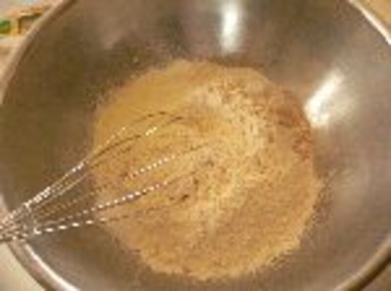 ボウルに強力粉、薄力粉、スキムミルク、イースト、砂糖、塩を取り、泡だて器で混ぜる。