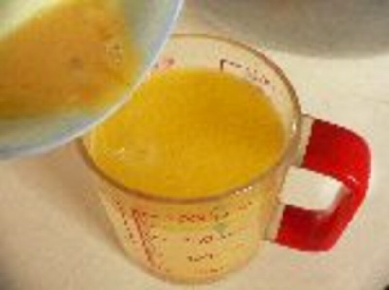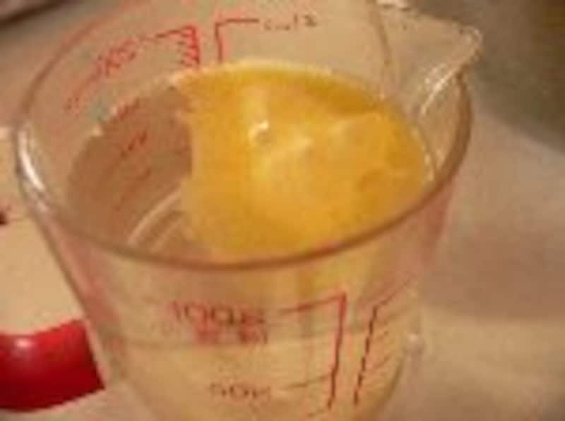 計量カップに湯を注ぎ、バターを加えて溶かし、少し冷ましておく。