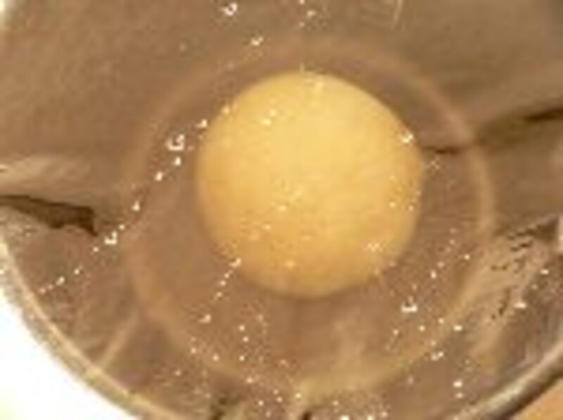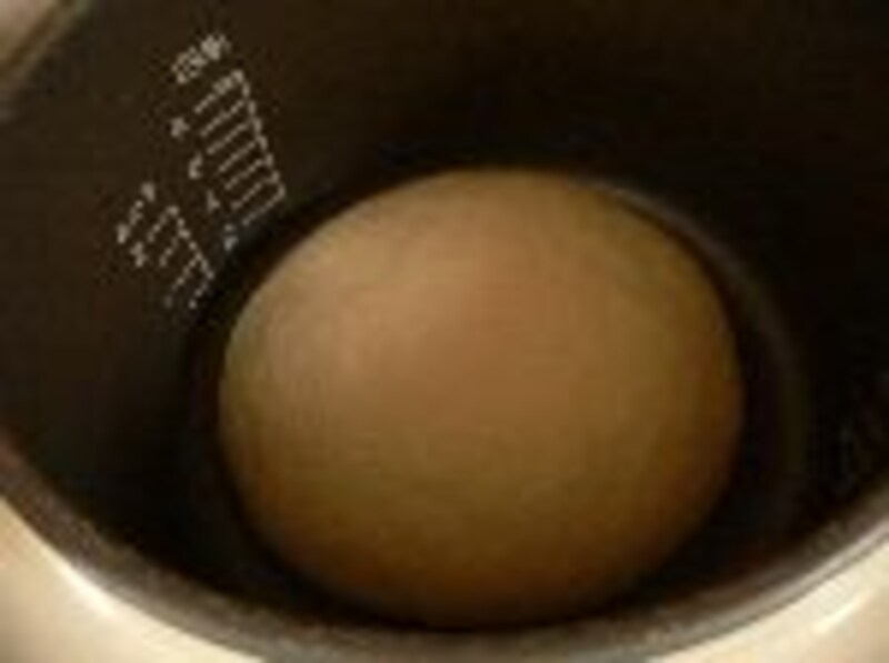 4分ほど、こねたり叩きつけたりしたら丸め、油を薄くぬった内釜に入れ、内側を水で濡らしたラップをかぶせ、炊飯器にセットする。