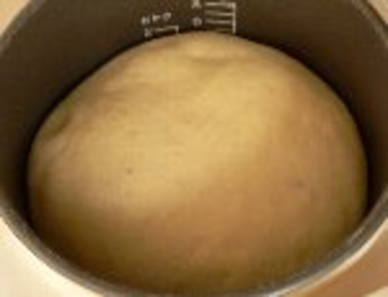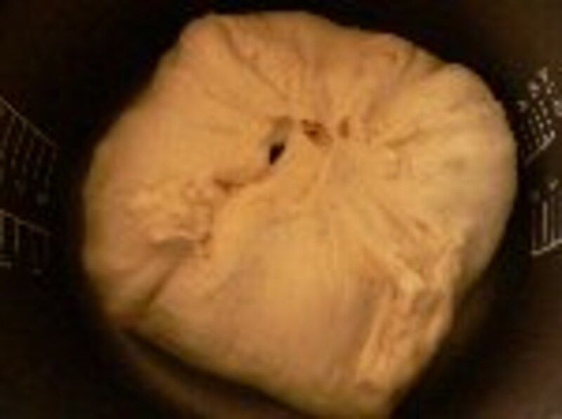 保温スイッチを入れて10分→スイッチを切って30分、2倍~2.5倍の大きさに発酵させる。(冬なので、2分保温→切って3分を足した。)