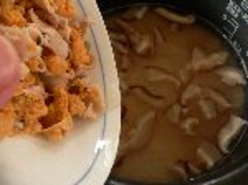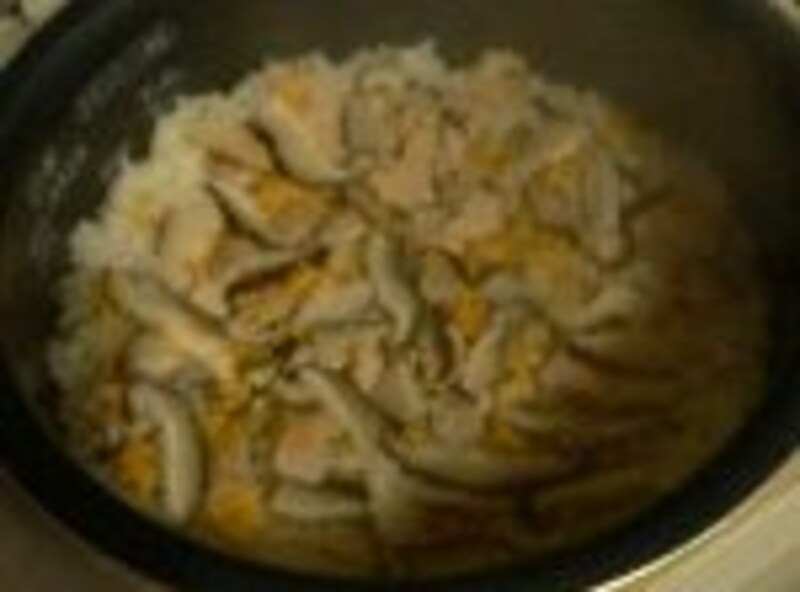 酒、醤油、塩を加え、3合の線まで水を足し、椎茸、具を加えて普通に炊く。