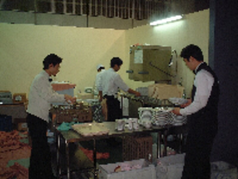 | オープンキッチンとサービス | お疲れさま! と食器洗いゾーン |