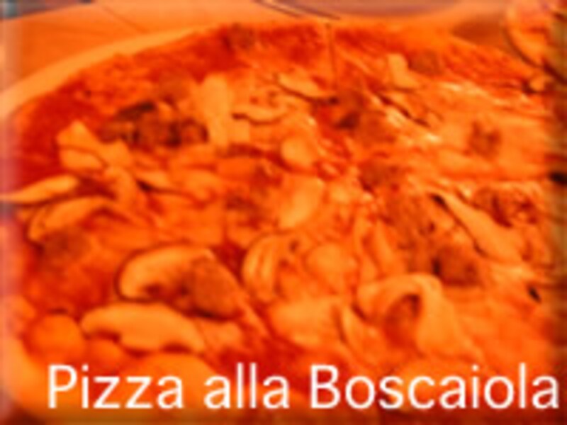 これは今月のオススメピッツァ。毎月オススメのピッツァがあります。今回はボスカイオーラで、キノコをふんだんに使ったピッツァです。それと自家製のサルシッチャ(ソーセージ)がのっていて、香り、味、食感と3拍子揃ったピッツァでした。