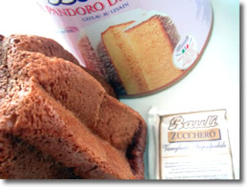 意外と知られていないパンドーロ。こちらはパネトーネとは異なり、ドライフルーツなどが入らない、スポンジ系の大きめのケーキ。卵を多く使うことからパンドーロ(黄金のパン)と呼ばれています。こちらはミラノのあるロンバルディア州の隣、ヴェネト州が発祥といわれています。ですからパンドーロの箱にもPan