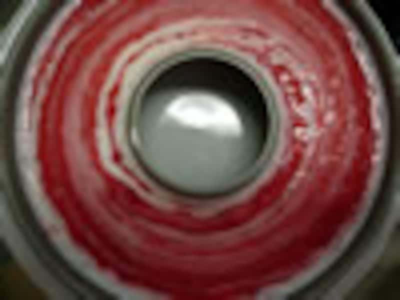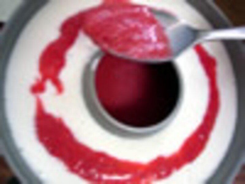 3.型に3のヨーグルトを入れ、スプーンで輪を描くようイチゴのピュレを注ぎ入れ、菜箸かナイフで20回位ゆっくりと輪をなぞっていく。