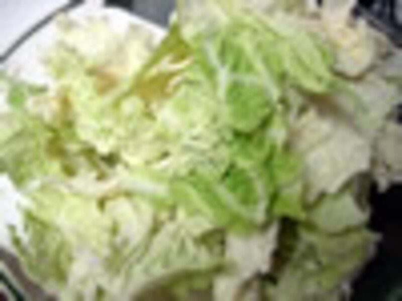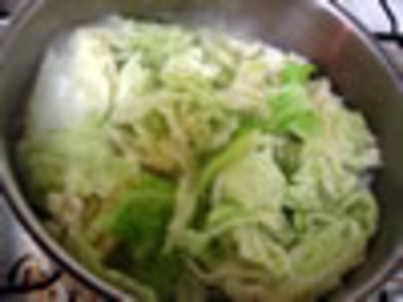 1.キャベツは一枚ずつ、手で食べやすい大きさにちぎり、芯を取り除きます。